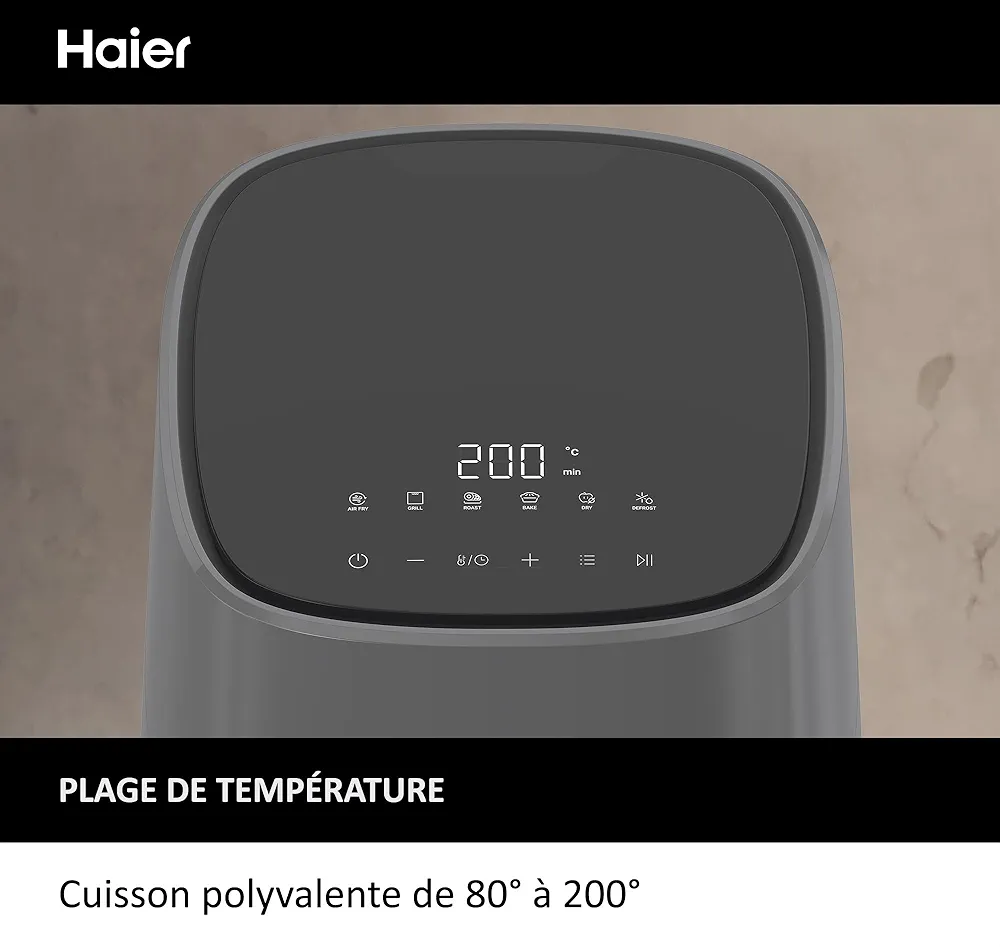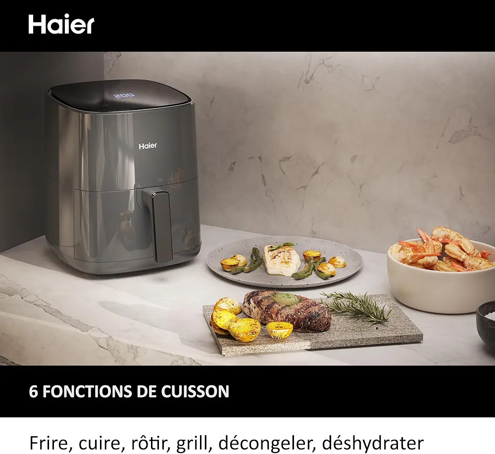 - 6-EN-1 : Fonctions de cuisson multiples avec la friteuse sans huile Haier. Frire, Cuire, Rôtir, Grill, Décongeler et Déshydrater