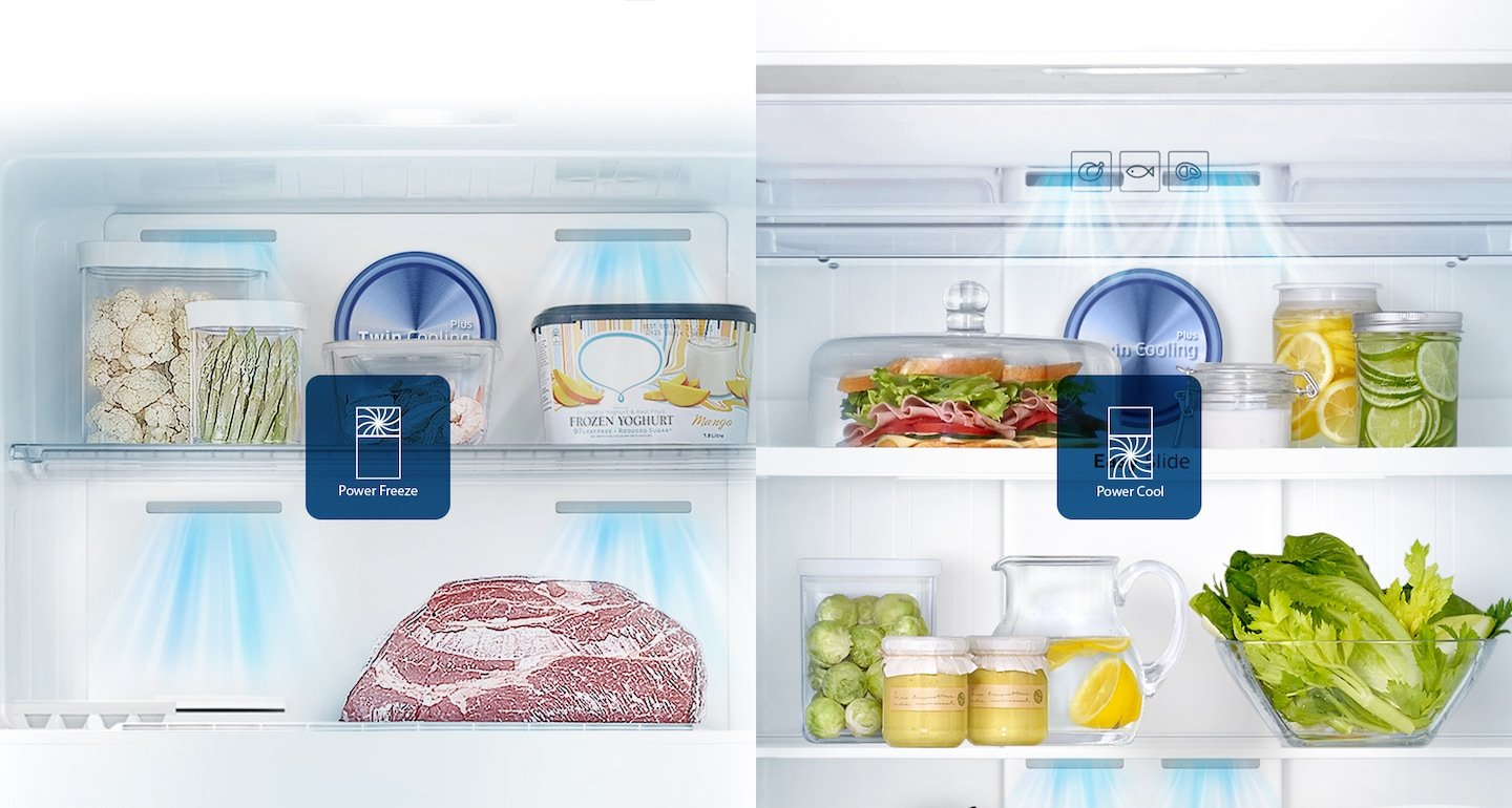 Il peut fournir rapidement de l’air extrêmement froid pour refroidir ou congeler à grande vitesse. Par simple pression sur une touche, Power Cool refroidit très vite boissons et aliments, tandis que Power Freeze est très utile pour congeler ou raffermir les aliments et faire de la glace.