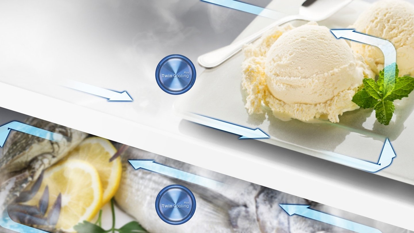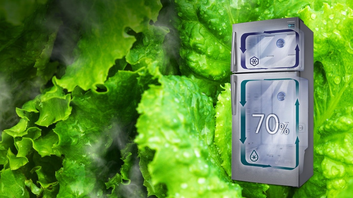 Seul le Twin Cooling Plus™ est capable de créer un environnement propice à la préservation des denrées fraîches dans le réfrigérateur, grâce à un taux d’humidité de 70%, comparé à 30% pour les réfrigérateurs conventionnels avec congélateur dans la partie supérieure. Ainsi, il préserve plus longtemps la fraîcheur des ingrédients, sans les dessécher.
